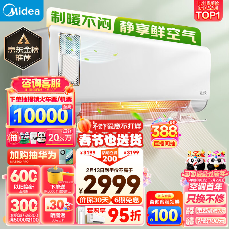 美的(Midea)新风空调 大1匹 静新风 新一级能效 变频冷暖除湿 壁挂式智能空调挂机 KFR-26GW/N8XF1-1定制版价格:2999.00元!