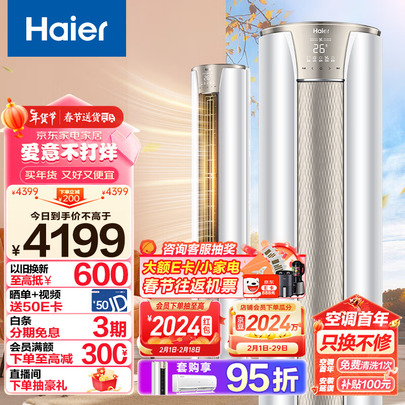 海尔(Haier)2匹 静悦 变频新能效 客厅圆柱空调立式柜机自清洁 京东小家智能 KFR-50LW/06KCA83U1 以旧换新价格:4199.00元!