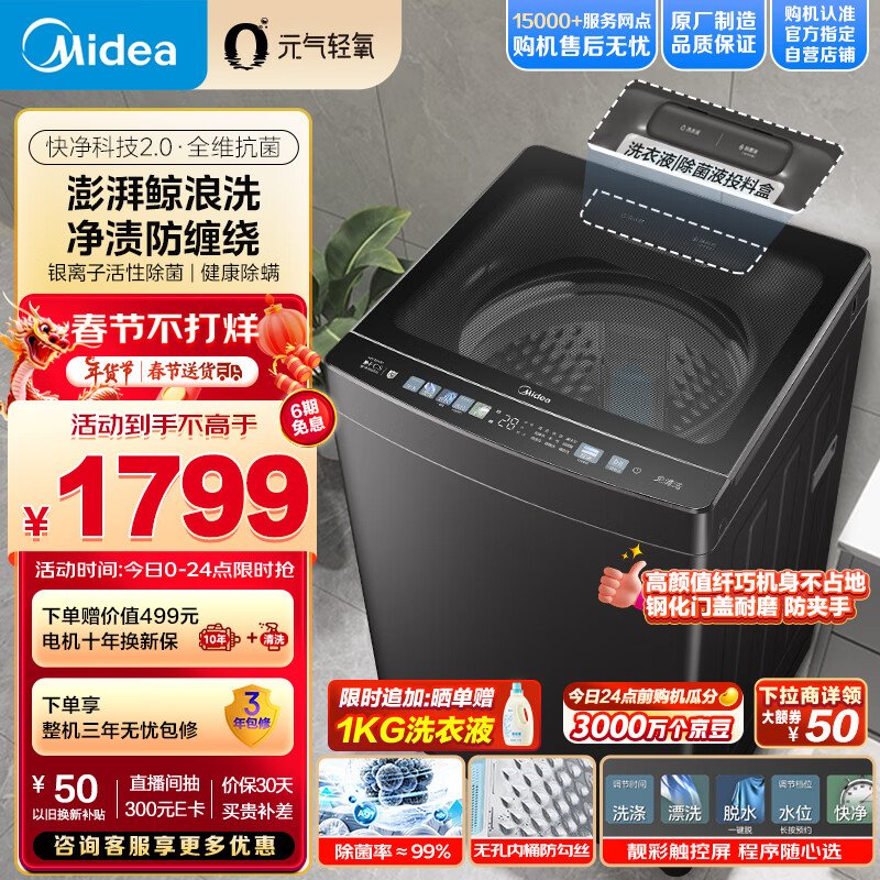 美的(Midea)波轮洗衣机全自动 元气轻氧系列 10公斤 快净科技 澎湃鲸浪洗 银离子除菌 健康除螨 MB100AIR1价格:1799.00元!