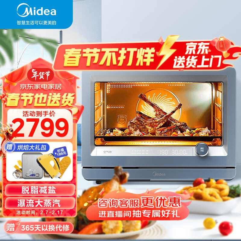 美的(Midea)乐见S5-fry 30L家用多功能电烤箱/蒸烤箱一体机/蒸烤炸一体 /热风循环/瀑流锁鲜蒸/APP智能操控价格:2799.00元!