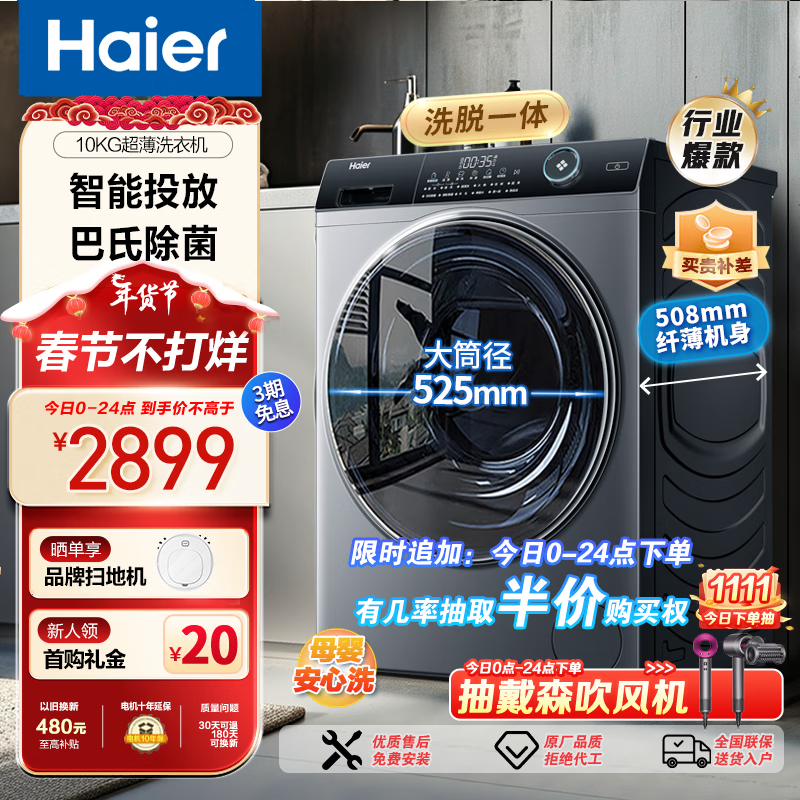 海尔(Haier)309超薄滚筒洗衣机全自动10公斤洗脱一体机变频超薄嵌入式大筒径智投筒自洁以旧换新14126升级款价格:2899.00元!