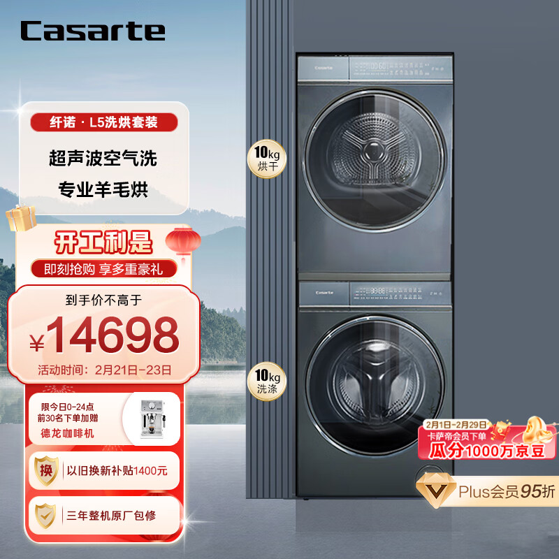 卡萨帝(Casarte)纤诺和美洗烘套装 直驱滚筒洗衣机全自动+热泵烘干机 匀蒸烘 以旧换新 C1 D10L5ELU1+CGQ 10FL5EU1价格:14698.00元!