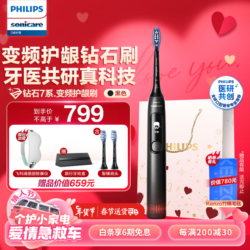 飞利浦电动牙刷情侣款新年情人节礼物送女友/男友 结婚礼物 5种模式智能显示屏2支护龈刷头钻石7系极夜黑价格:919.00元!