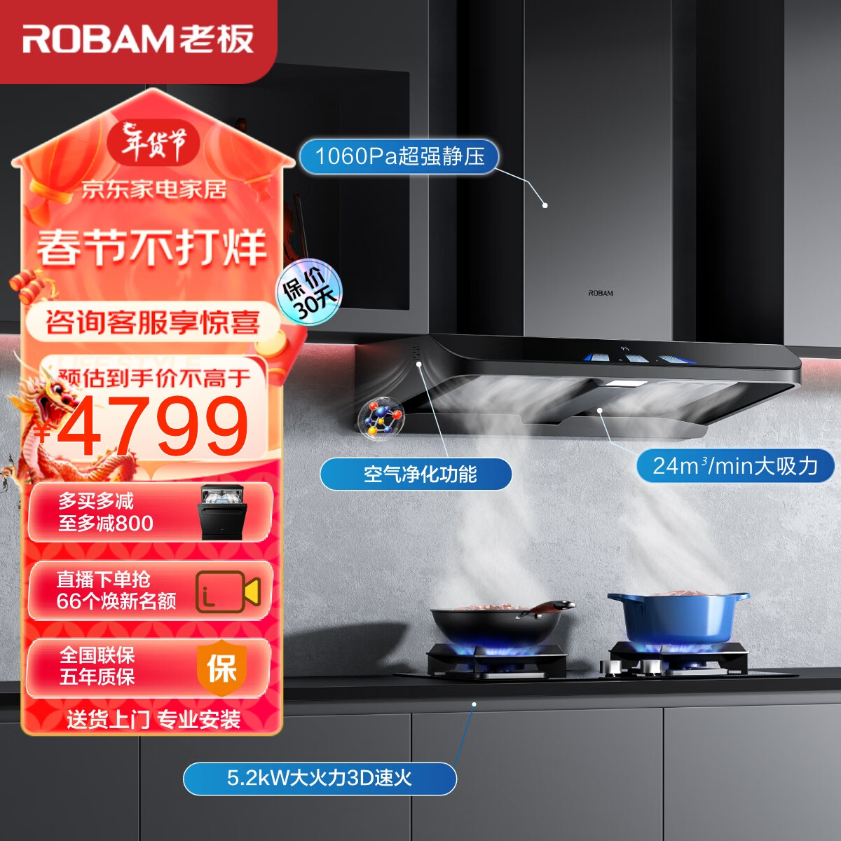 老板(Robam)抽油烟机 钢琴家D3S欧式24大吸力变频家用燃气灶吸油烟机灶具套装62D3S+57B2DT京东小家智能生态价格:4799.00元!