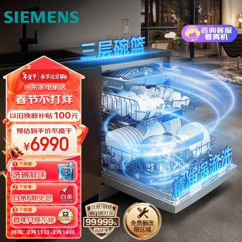 西门子16套大容量除菌消毒 独嵌两用全能舱洗碗机嵌入式 精准涡流洗 智能抽湿烘干 96h存储 SJ23HI88MC价格:6990.00元!