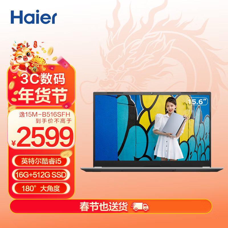 海尔(Haier)15.6英寸金属笔记本电脑 商务办公学生影音娱乐轻薄本 逸15M 11代i5 (16G 512G SSD Win11)价格:2599.00元!