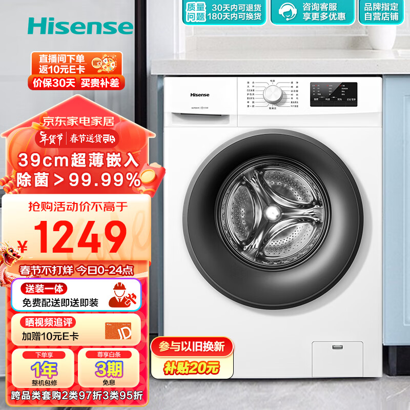 海信(Hisense)7公斤滚筒洗衣机全自动 超薄嵌入 小型家用 除菌洗 冷水护色洗HG70DA10以旧换新价格:1249.00元!