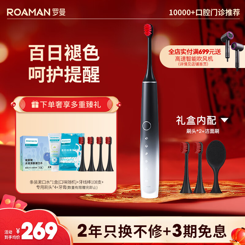 罗曼(ROAMAN)电动牙刷成人情侣套装男女智能声波电动牙刷软毛洁面 T40小心机墨雾黑 节日新年礼物价格:299.00元!