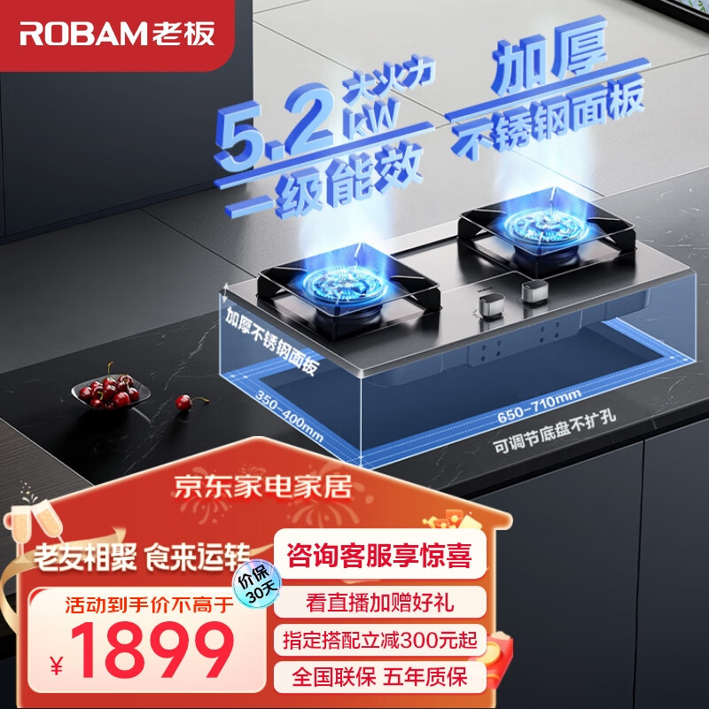老板(Robam)JZT-57G7A易洁耐用不锈钢5.2kW猛火燃气灶天然气灶双灶家用嵌入式可调节底盘灶具灶台价格:1899.00元!