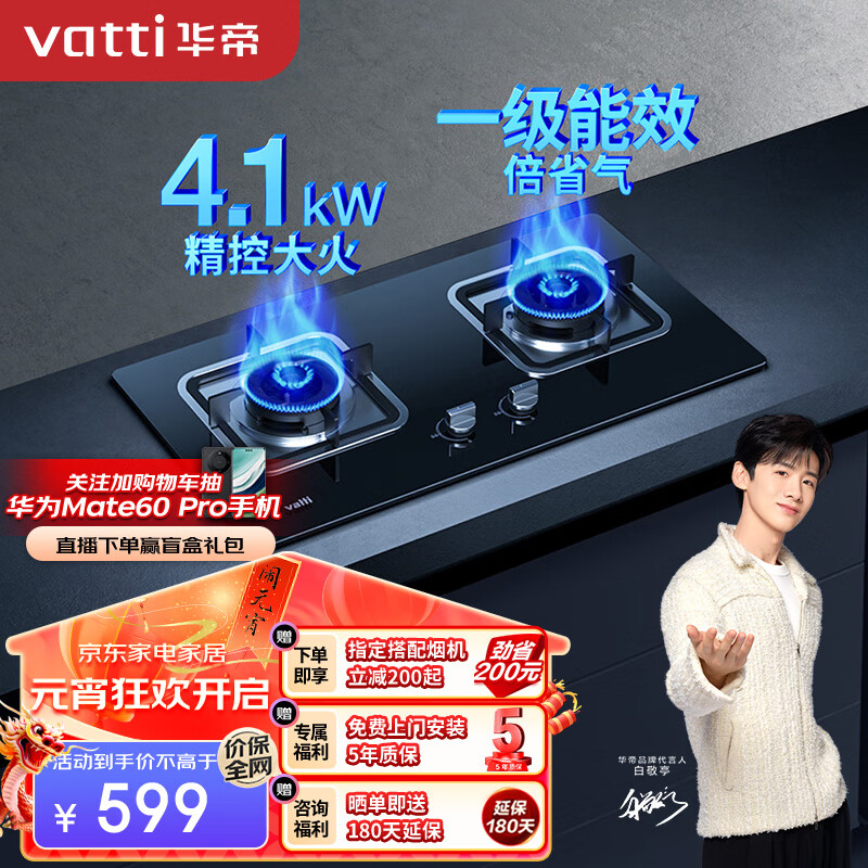 华帝(VATTI)燃气灶家用台式嵌入式 4.1kW钢化玻璃面板台嵌两用 双灶台灶具JZT-i10039B(天然气)价格:599.00元!