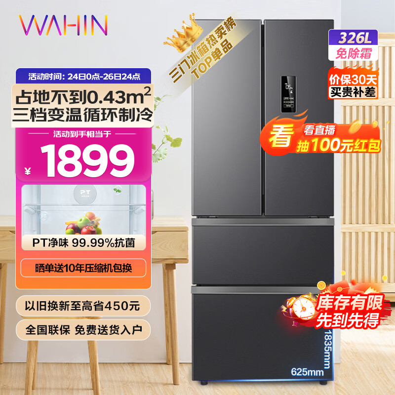 华凌 美的冰箱出品326升法式多门一级能效双变频风冷家用电冰箱节能保鲜净味居家冰箱BCD-326WFPH价格:1899.00元!