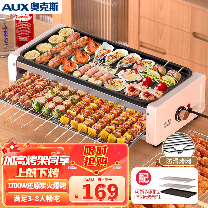 奥克斯(AUX)电烧烤炉 电烤盘家用无烟电烤架烧烤炉烤肉机电烤炉烤肉锅烤串机 双烤网+烤盘价格:169.00元!