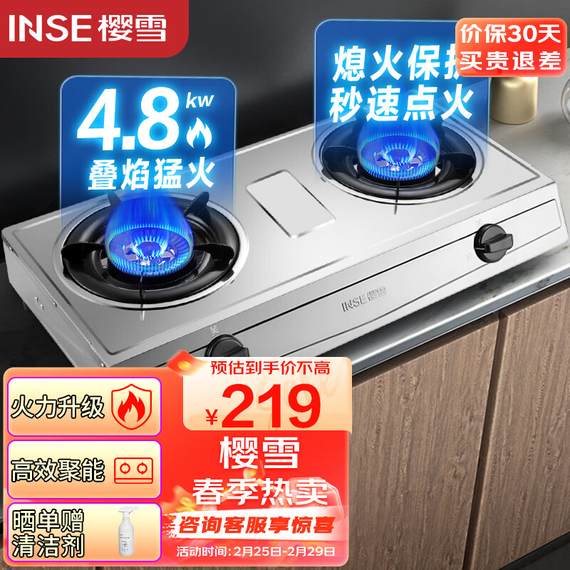 樱雪(INSE)燃气灶双灶具 台式双灶 煤气灶双灶 4.8w猛火升级 家用不锈钢双眼台灶熄火保护T1502 天然气价格:219.00元!