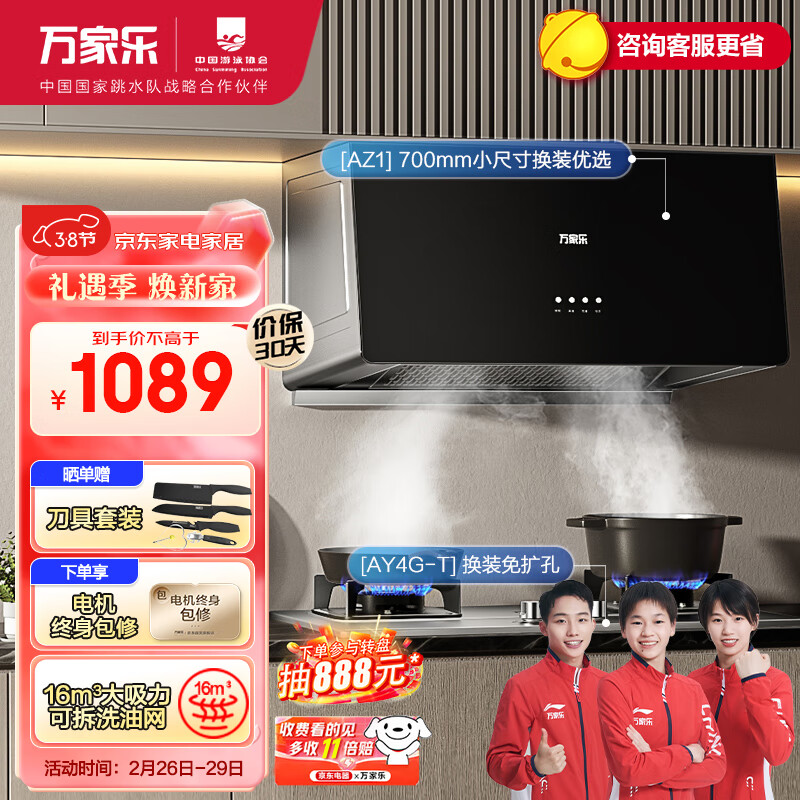 万家乐抽油烟机 中式油烟机套装16立方小尺寸大吸力小户型换新免扩孔不锈钢燃气灶套装AZ1+AY4G天然气价格:1089.00元!