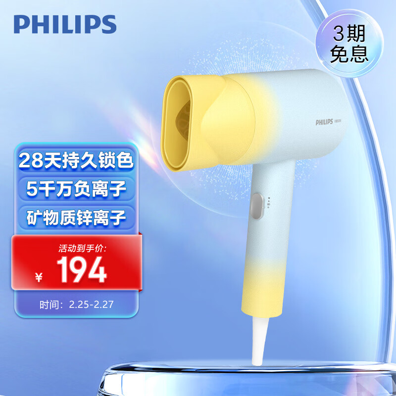 飞利浦(PHILIPS)电吹风机 3系炫色筒 锌离子防晒护色 5000万负离子 烫染修复 奶油黄价格:194.00元!