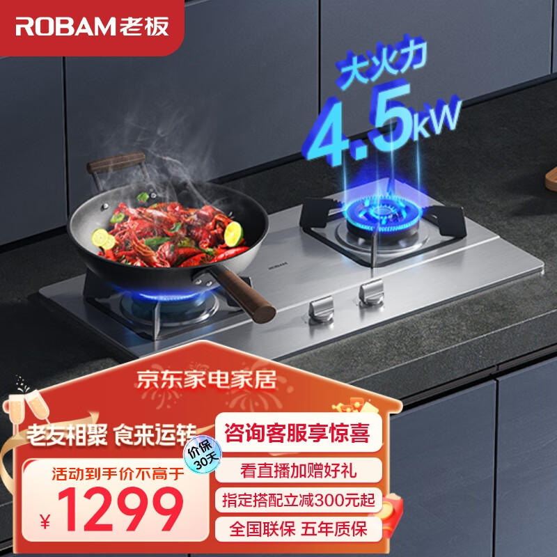 老板(Robam)JZT-32G9A燃气灶嵌入式灶具 家用双灶双尺寸锅架台嵌两用4.5kW大火力耐用不锈钢天然气价格:1299.00元!