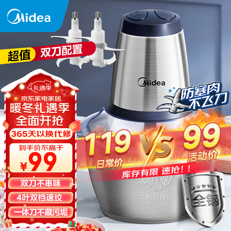 美的(Midea)绞肉机家用碎肉机电动多功能料理机全钢打肉机婴儿辅食机搅拌绞馅机双刀搅肉机LZ25Easy235B价格:99.00元!