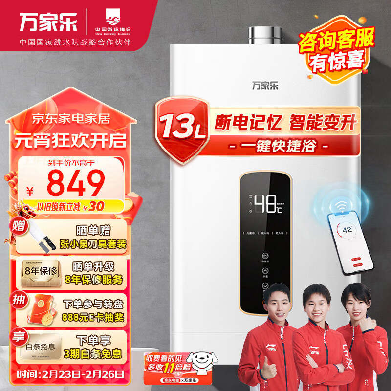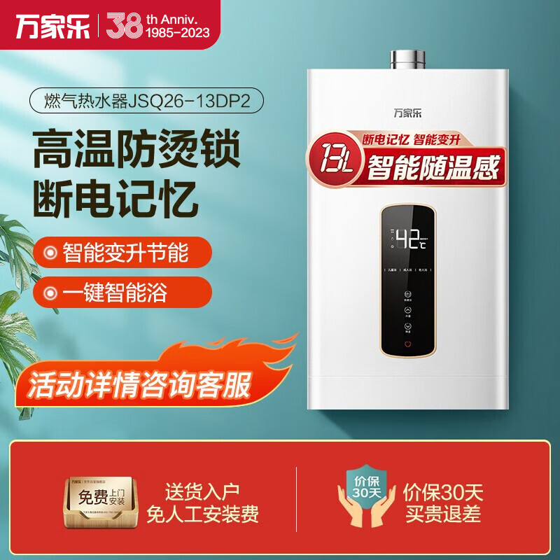 万家乐 13升燃气热水器(天然气)智能变升节能一键智能浴高温防烫锁断电记忆JSQ26-13DP2【主动防冻】价格:849.00元!