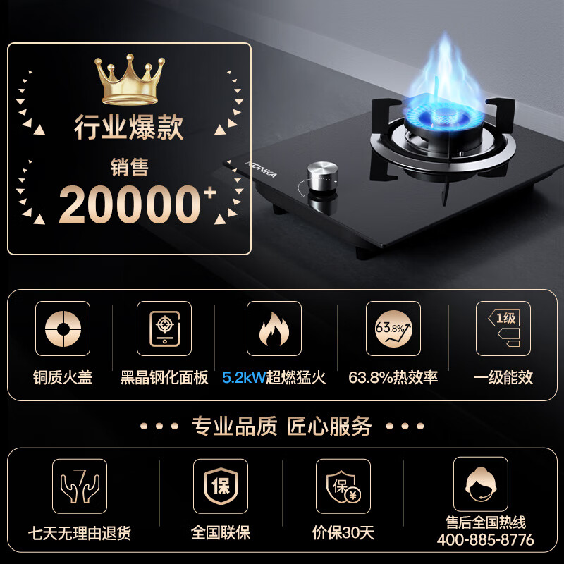 康佳(KONKA)燃气灶单眼灶具 5.2kW家用大火力灶 台式/嵌入式一级能效玻璃灶台 JZT-D431Y(天然气)价格:198.00元!