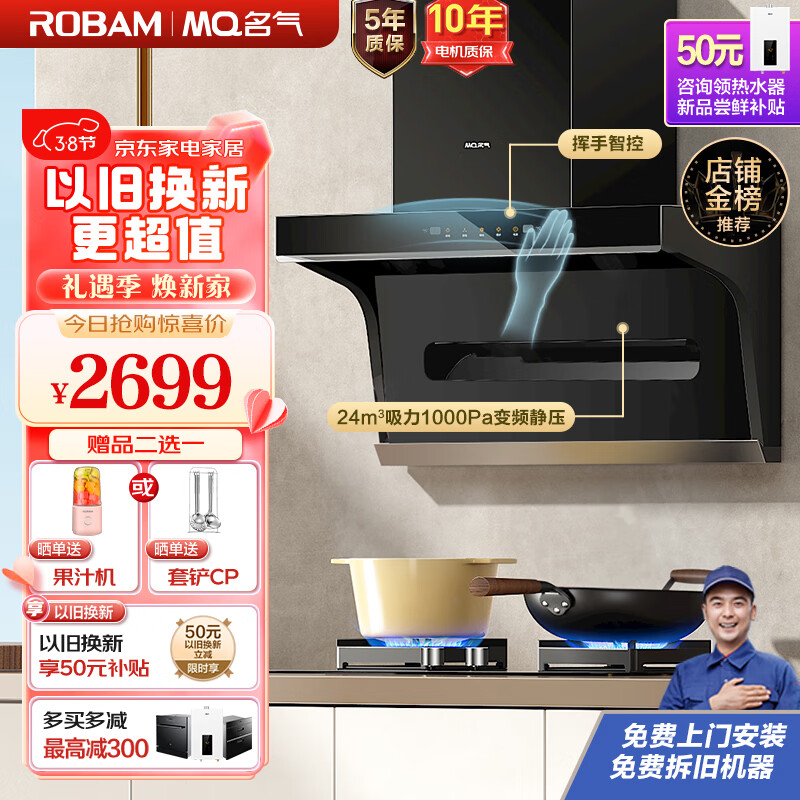 名气(MQ)老板抽油烟机7字型家用顶侧双吸变频油烟机家用24大吸力1000Pa变频烟灶套装双天然气A5508+6510B价格:2699.00元!