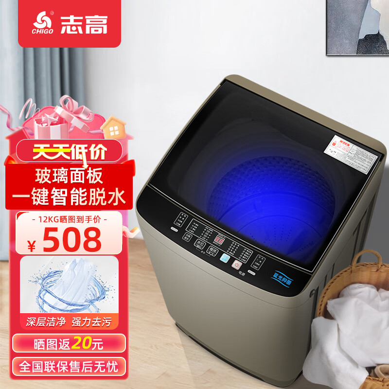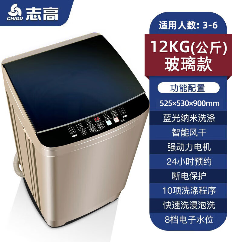 志高(CHIGO)12KG大容量全自动波轮洗衣机家用宿舍租房免清洗智能洗脱一体全自动洗衣机 XQB120-8189玻璃价格:578.00元!