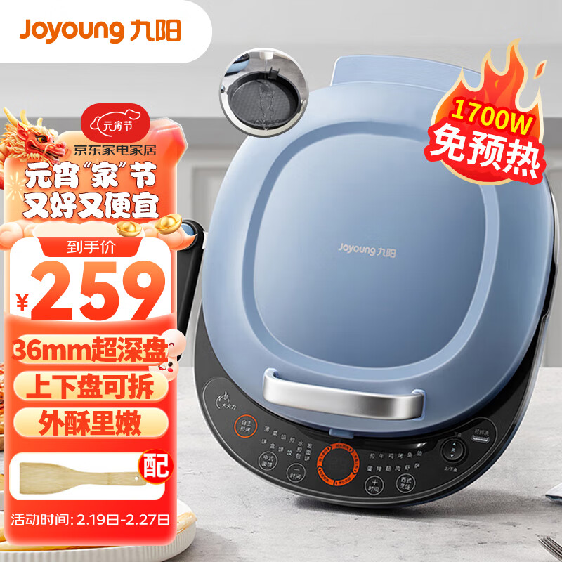 九阳(Joyoung)电饼档上下盘可拆洗早餐机36mm加深烤盘双面加热烙饼锅1700W大火力煎烤机JK30-GK565价格:259.00元!