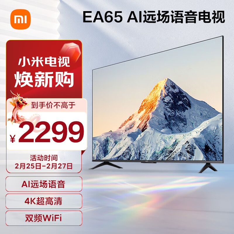 小米电视EA65 65英寸 金属屏 远场语音 逐台校准4K超高清智能教育电视机L65MA-EA以旧换新价格:2299.00元!