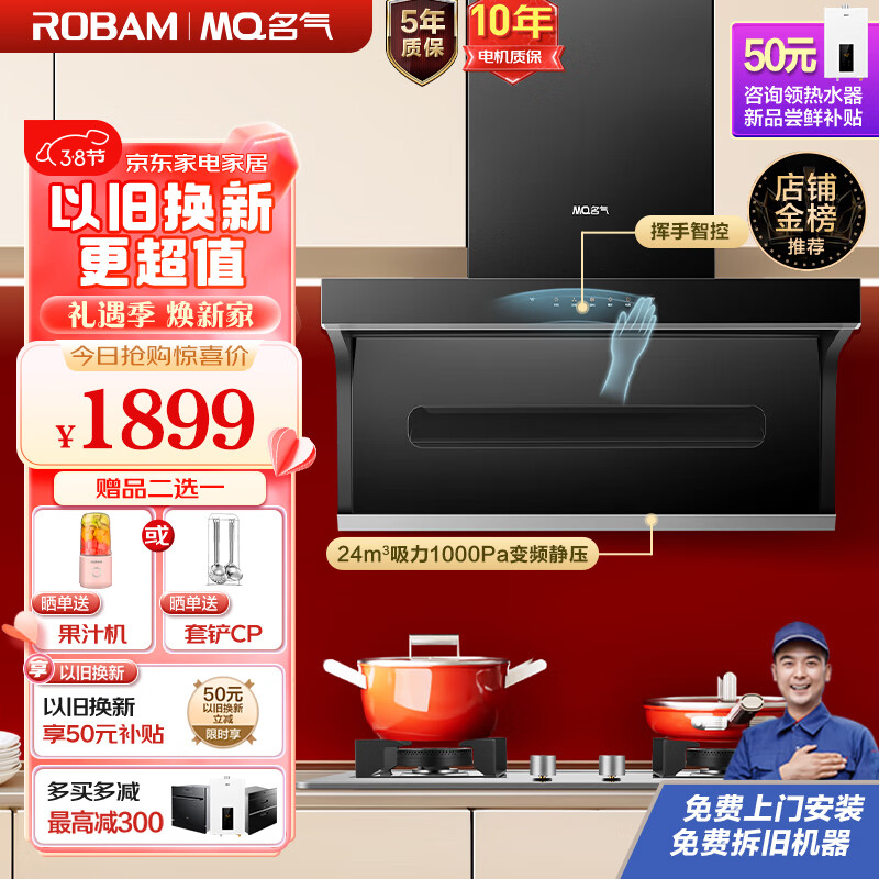 名气(MQ)老板抽油烟机顶侧双吸7字型变频油烟机家用 24m大吸力1000Pa变频静压挥手智控吸烟机排烟机A5508价格:1899.00元!