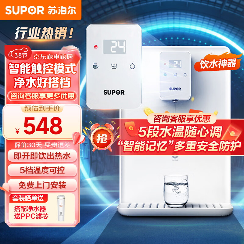 苏泊尔(SUPOR)管线机壁挂式反渗透净水器伴侣直饮机20G3智能触屏3秒速热5档控温贴心童锁台式加热饮水机价格:548.00元!
