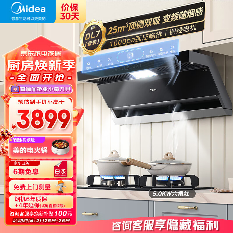 美的(Midea)抽油烟机燃气灶具家用顶侧双吸25风量大吸力变频烟感 7字型排烟机新静吸烟灶套装DL7+Q70天然气价格:3899.00元!