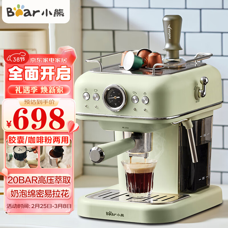小熊(Bear)咖啡机家用意式泵压式20Bar高压喷射可打奶泡1.2升大容量 咖啡粉/咖啡胶囊/两用KFJ-E12Q5价格:698.00元!