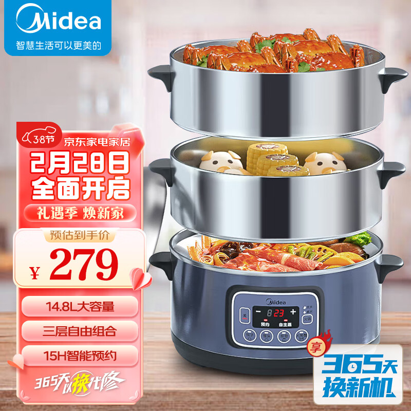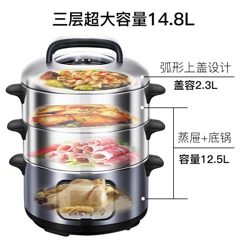 美的(Midea)电蒸锅多功能家用电火锅电煮锅电热锅三层大容量14.8L大容量智能预约MZ-ZG28Power501价格:279.00元!