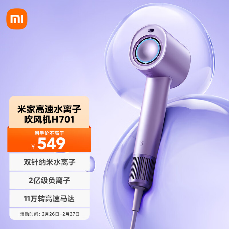 米家小米高速水离子吹风机H701 家用大风力 大功率速干降噪 双水离子护发 星钻紫 礼物推荐价格:549.00元!