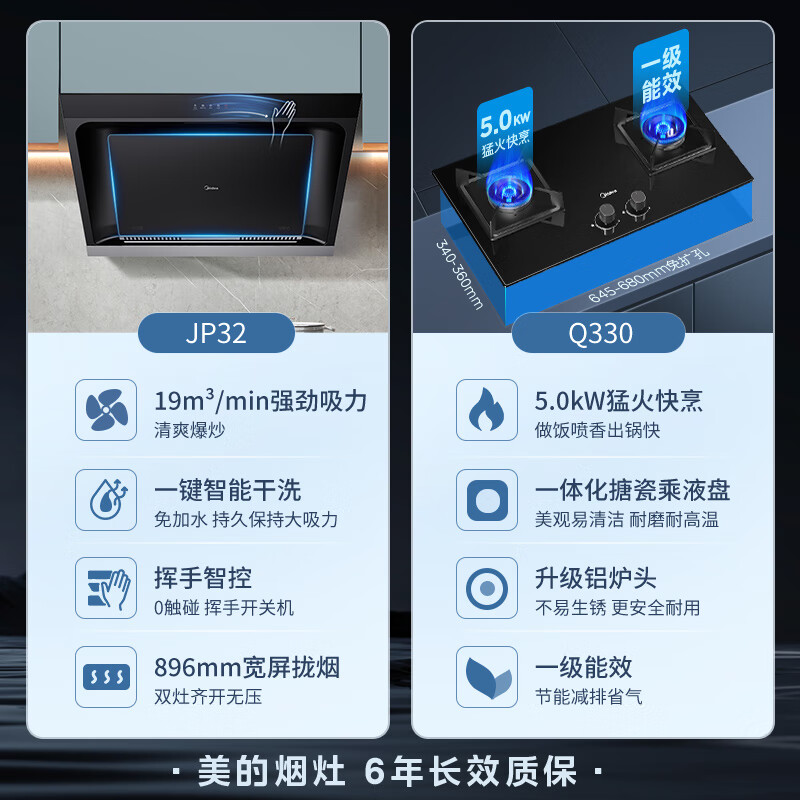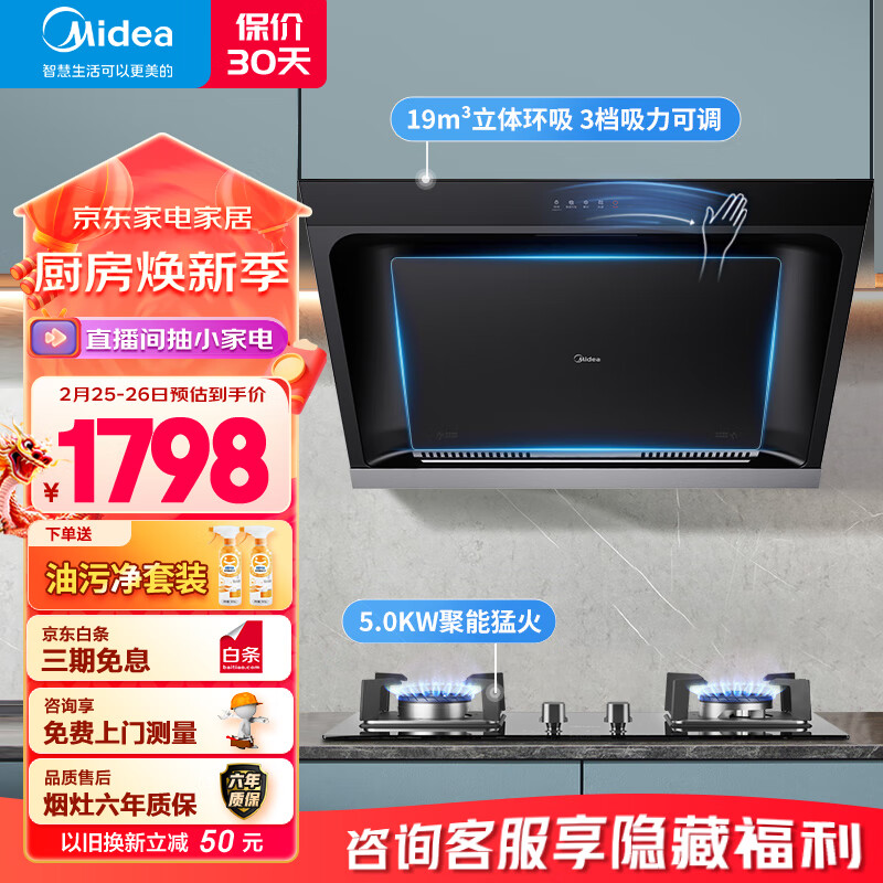 美的(Midea)抽烟机燃气灶套装 家用19风量侧吸自动清洗脱排烟机油烟机 5.0kW一级能效灶JP32+Q330液化气价格:1798.00元!
