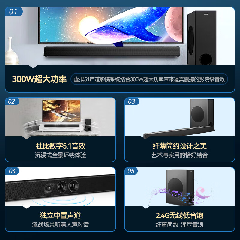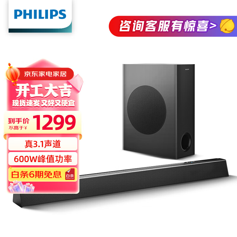 飞利浦(PHILIPS)HTL3320 回音壁 电视音响 300W大功率 杜比音效 虚拟5.1环绕 家庭影院 蓝牙音箱 无线低音炮价格:1699.00元!
