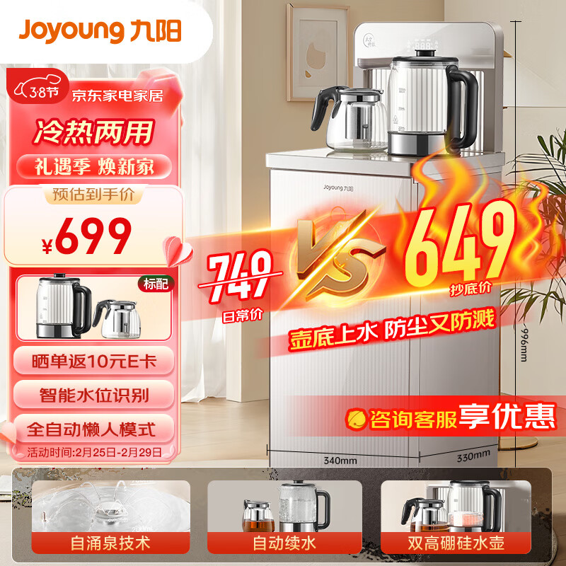 九阳(Joyoung)茶吧机 家用高端智能饮水机一键全自动下进水 多功能遥控立式下置水桶 JCM82C价格:649.00元!