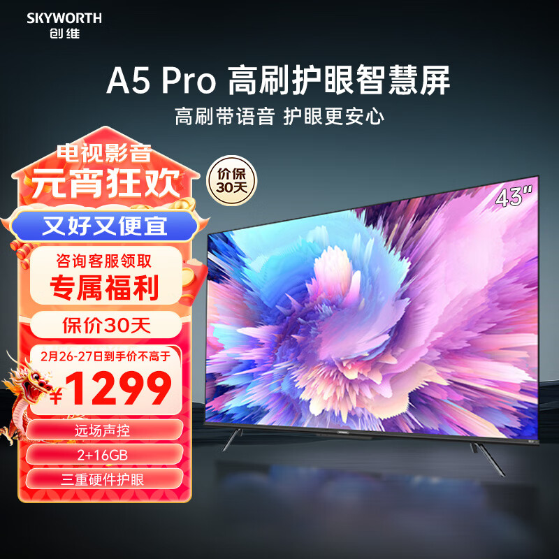 创维电视43A5 Pro 43英寸超薄屏 4K高清护眼防蓝光 远场声控 一键投屏 游戏电视机 2+16GB大内存 5T-A5 Pro云游戏电视价格:1299.00元!