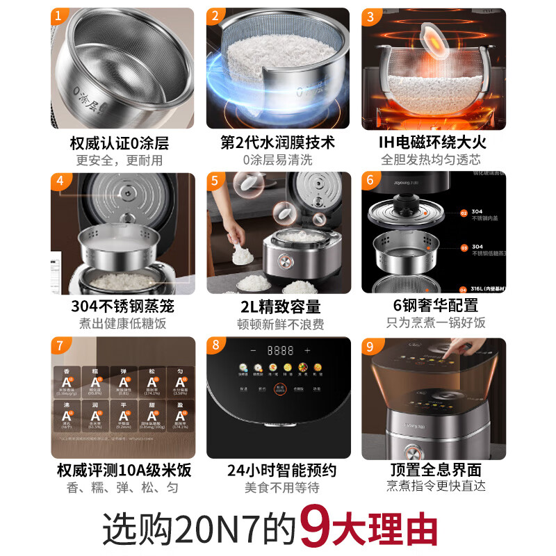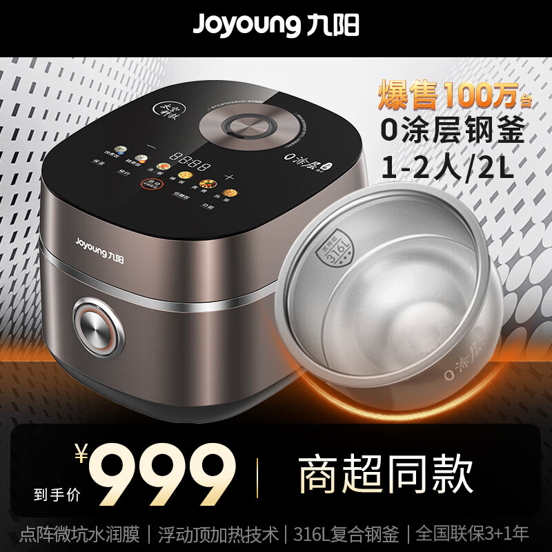 九阳(Joyoung)【2代0涂层】2L小型不粘电饭煲电饭锅点阵微坑水润膜IH电磁上下加热316L钢釜10A认证无涂层2升20N7价格:999.00元!