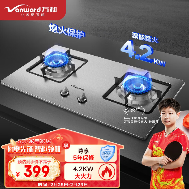 万和(Vanward)家用台式嵌入式燃气灶具 双眼灶 4.2kW大火力 不锈钢煤气炉煤气灶 JZY-B6B338XW(液化气)价格:389.00元!