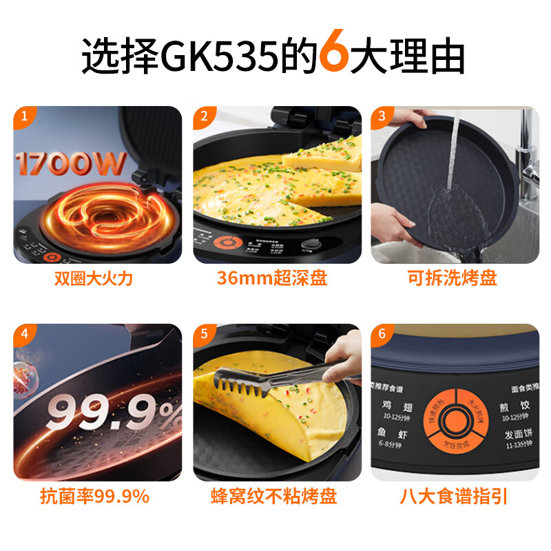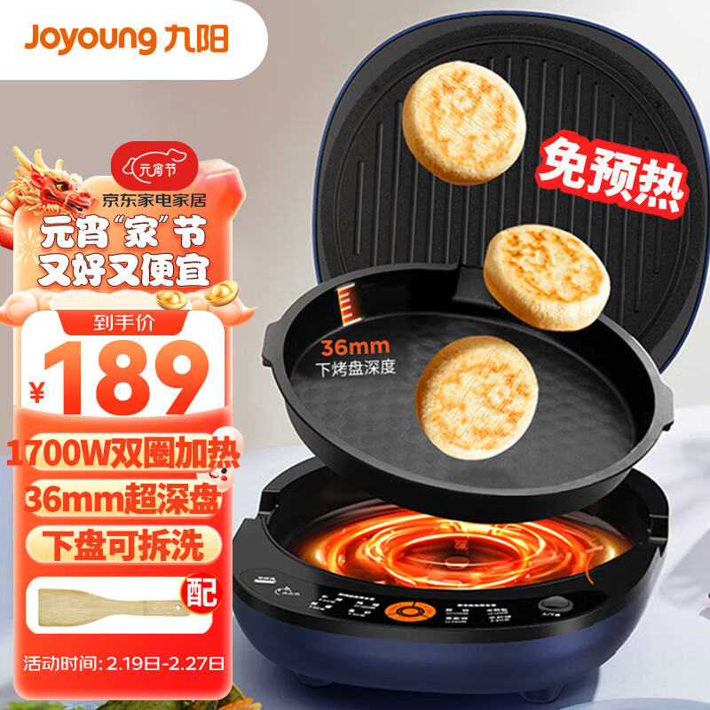 九阳(Joyoung)电饼铛家用煎烤机36mm加深烤盘下盘可拆早餐机1700W大火力烙饼机JK30-GK535价格:189.00元!