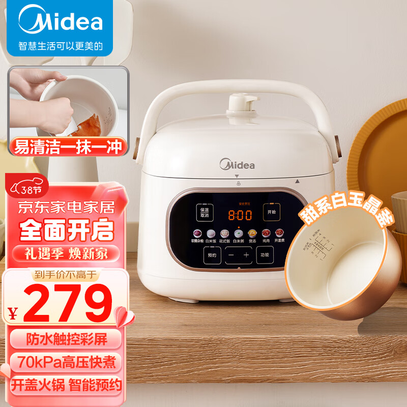 美的(Midea)一人食迷你电锅2.2L开盖火锅家用智能预约触控面板白晶易清洁内胆MY-C244高压锅电饭煲1-3人价格:279.00元!