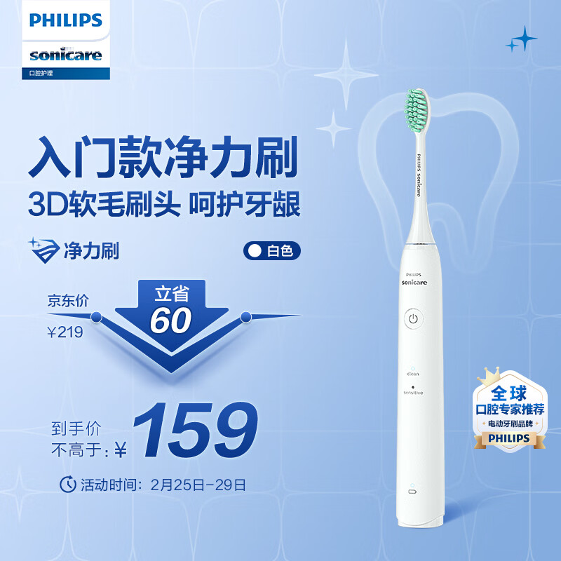 飞利浦(PHILIPS)电动牙刷成人 情侣款 新年 情人节礼物送女友/男友入门款 2种模式洁齿护龈净力刷 白色HX2431/02价格:167.00元!