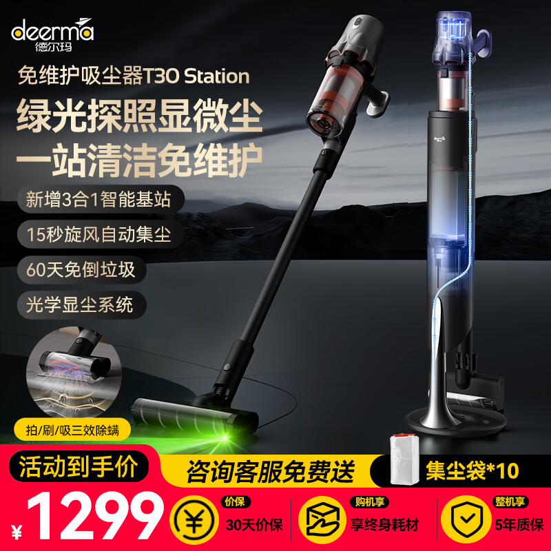 德尔玛(Deerma)T30station无线吸尘器 60天免倒尘收纳充电自集尘基站 免打理尘袋 绿光显尘 电动除螨刷 38好礼价格:1299.00元!