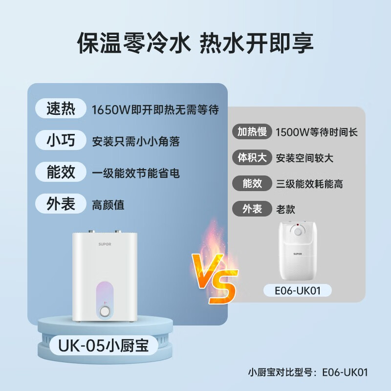 苏泊尔(SUPOR)6.8升迷你电热水器小厨宝速热式厨房热水器即热式上出水一级能效节能 UK05 【1650W】6.8升E06-UK05价格:348.00元!