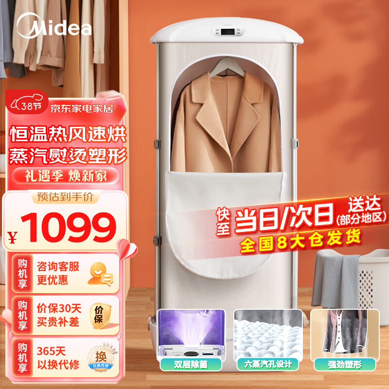 美的(Midea)衣物护理机 烘干机家用婴儿 全自动挂烫机 蒸汽熨烫除皱 高温杀菌香薰祛味 干衣机 MHJ90-01QUW价格:1099.00元!