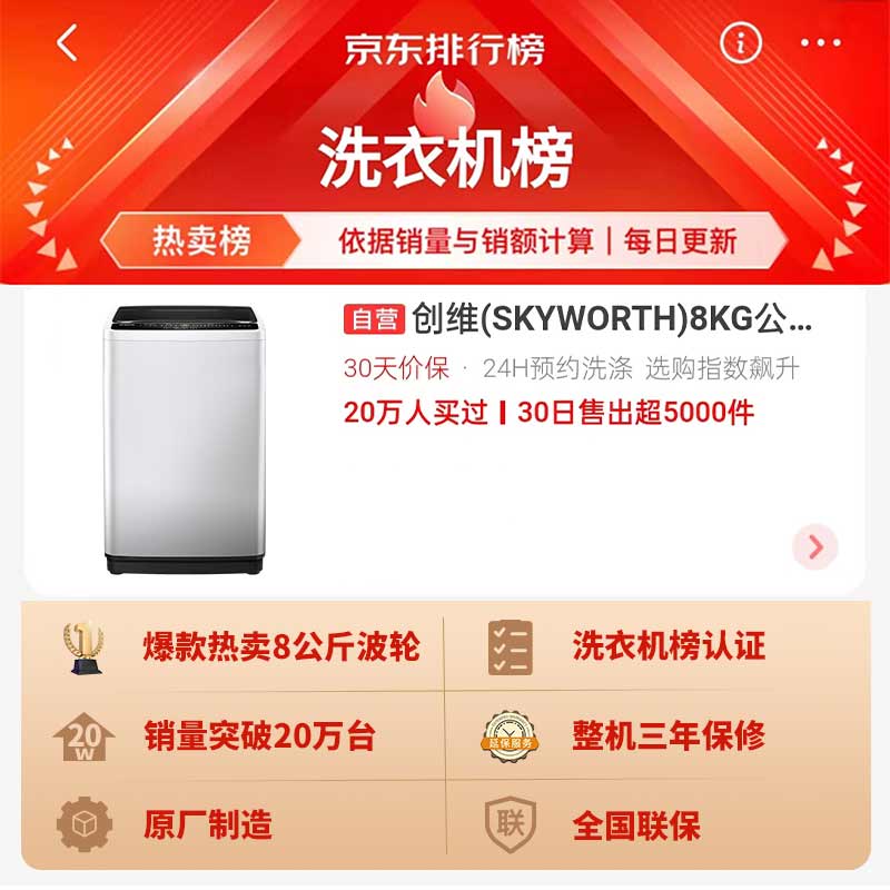 创维(SKYWORTH)8KG公斤大容量全自动波轮洗衣机家用 小型 超薄 租房神器 15分钟快洗 洁净桶风干T80F价格:549.00元!