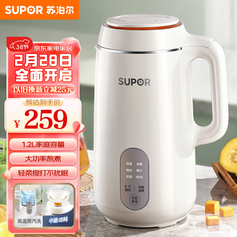 苏泊尔(SUPOR) 豆浆机 1.2L家用大容量多功能全自动破壁免滤可预约高温洗破壁机早餐机 DJ12B-P29E价格:259.00元!