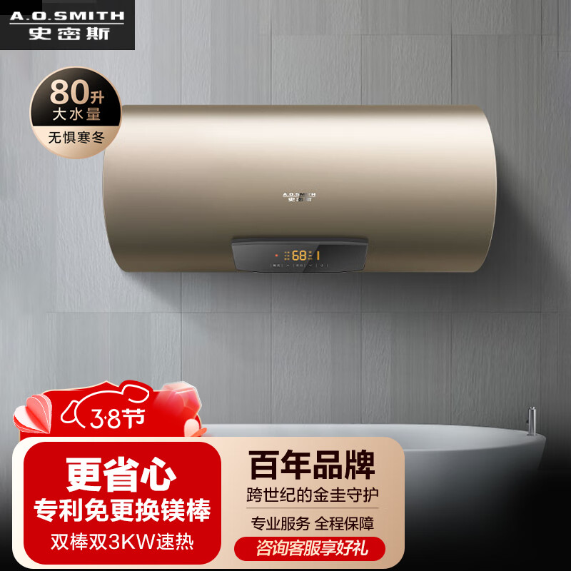 史密斯(A.O.SMITH)80升电热水器 专利免更换镁棒 金圭内胆 双棒双3kW速热 晶彩外观 遥控E80MDF 一级能效价格:3298.00元!