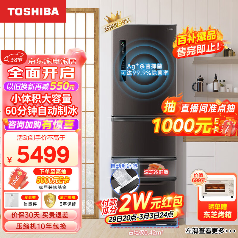 东芝(TOSHIBA)日式多门五门小户型家用高端电冰箱大容量超薄嵌入式自动制冰无霜GR-RM433WE-PM237绸缎灰价格:5477.00元!