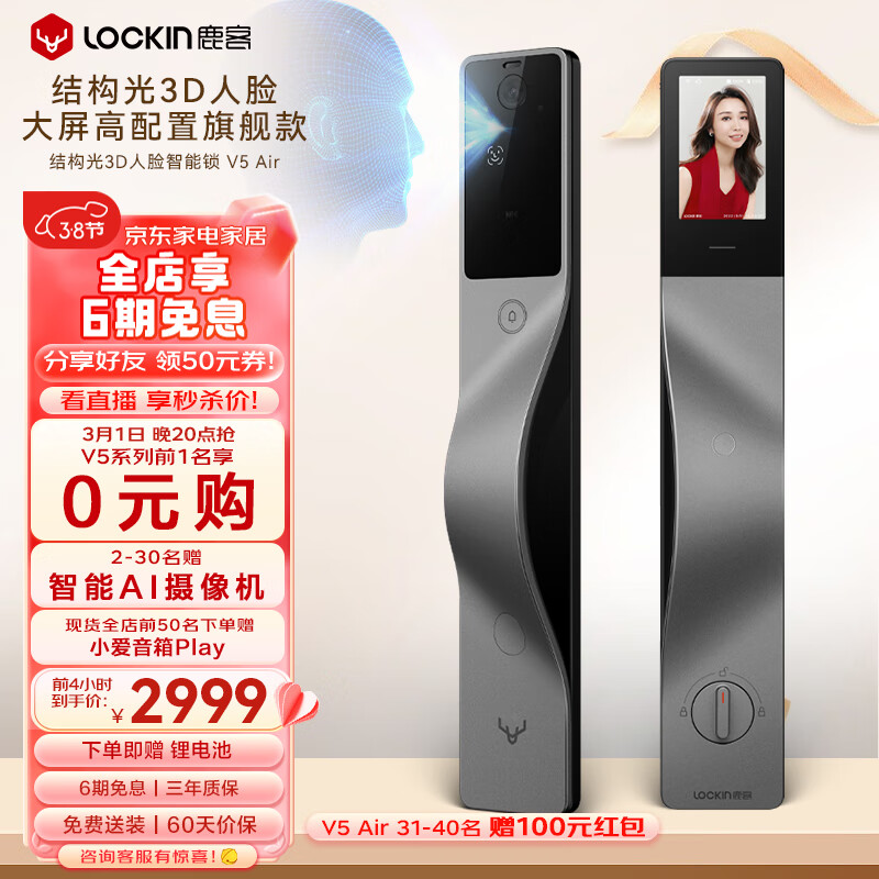 鹿客(lockin)V5 Air结构光人脸识别猫眼大屏智能密码锁APP智联适用右开门价格:3699.00元!